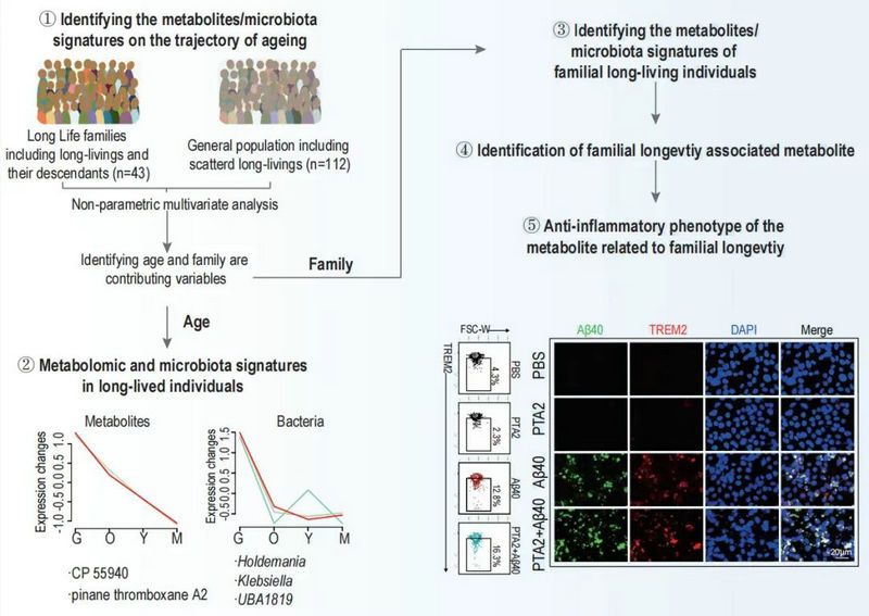 研究發現長壽家族隊列的長壽個體擁有不同于普通人群長壽個體的微生物組和代謝組特征,并進一步發現與衰老呈正或負相關的系列代謝物,其中正相關代謝物蒎烷血栓素 A2 (PTA2) 的水平在長壽家族個體及其年輕后代中始終高于普通人群,并與年齡正相關;互作網絡分析結果表明這些與衰老正相關的代謝產物與腸道瘤胃菌科(Ruminococcaceae), Intestinimonas, Alistipes, 乳球菌(Lactococcus)等的相對豐度緊密相關。進一步的功能分析顯示 PTA2 通過激活STAT6信號途徑上調小膠質細胞中TREM2的表達,增強了小膠質細胞吞噬具有神經毒性作用的β-淀粉樣蛋白40(Aβ40)的效率并提高了抗炎表型,表明 PTA2 對宿主健康具有保護作用。為進一步證實在生理濃度下PTA2的這一作用,合作團隊用基于液相色譜串聯質譜法(LC-MS/MS)定量測定了健康人群和與老齡相關的腦小血管病人(ASVD)血清樣本中PTA2的濃度,發現病人的PTA2濃度顯著低于健康人群。綜上,本研究證實腸道微生物組及其代謝產物在健康老化中的作用,提示PTA2可以作為健康老化潛在的干預靶點之一。