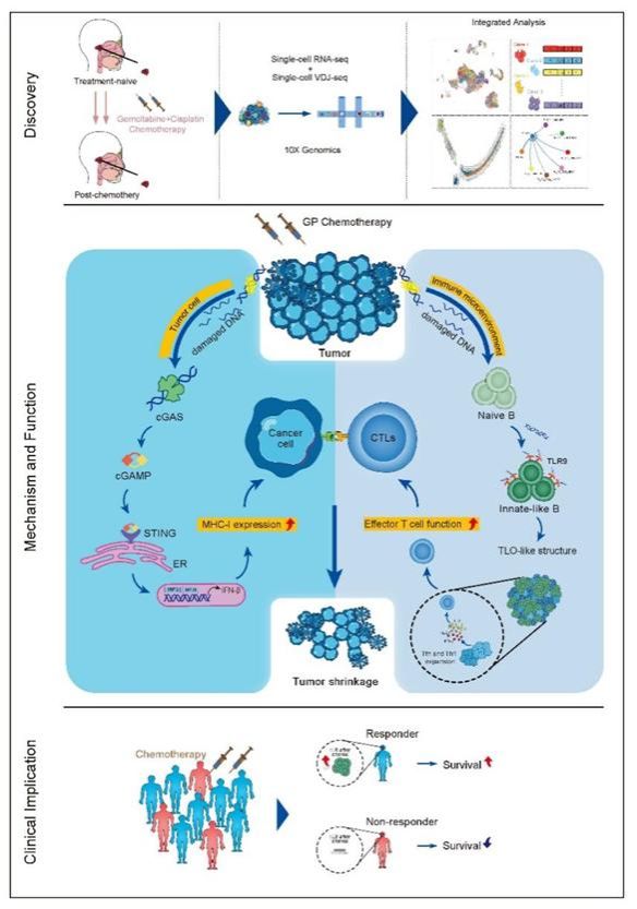 該研究發(fā)現(xiàn),GP化療介導(dǎo)的腫瘤細胞DNA片段釋放可通過Toll-like receptor 9(TLR9)信號誘導(dǎo)CD27+IgD+IgM+先天樣B細胞亞群(innate-like B cell, ILB),該亞群定位于化療誘導(dǎo)的類三級淋巴樣結(jié)構(gòu)中,通過ICOSL-ICOS信號軸促進I型輔助性T細胞(TH1)和濾泡輔助性T細胞(TFH)的擴增,進而促進細胞毒性CD8+ T細胞(Cytotoxic T Lymphocyte, CTL)的殺傷功能;與此同時,其還可激活腫瘤細胞的STING-type-I-interferon通路,進而上調(diào)腫瘤細胞主要組織相容性復(fù)合體(major histocompatibility complex, MHC)class I的表達。二者形成環(huán)路,最終,激活的免疫系統(tǒng)有效識別和殺傷鼻咽癌細胞。這項研究闡明了化療免疫調(diào)節(jié)作用的新機制,提出了以B細胞為核心的抗腫瘤免疫網(wǎng)絡(luò)新理論,研究結(jié)果將為建立鼻咽癌化療聯(lián)合免疫治療新策略提供重要理論依據(jù)。