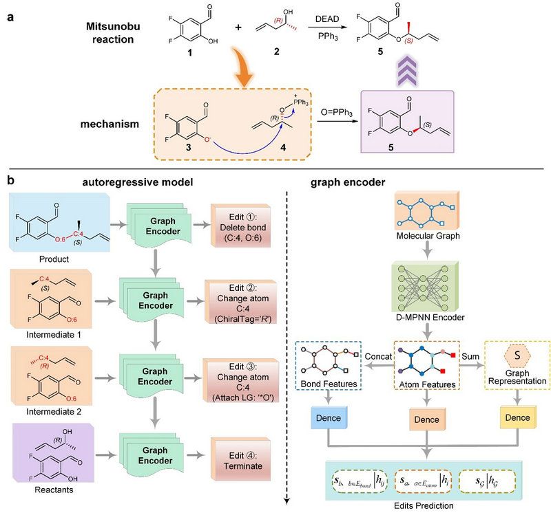研究成果于2023年5月在Nature Communications上發(fā)表(IF = 17.694),題目為“Retrosynthesis prediction using an end-to-end graph generative architecture for molecular graph editing”。中山大學(xué)智能工程學(xué)院陳語(yǔ)謙教授為該文通訊作者,智能工程學(xué)院博士生衷維荷為第一作者。該項(xiàng)研究受到國(guó)家自然科學(xué)基金項(xiàng)目的支持。