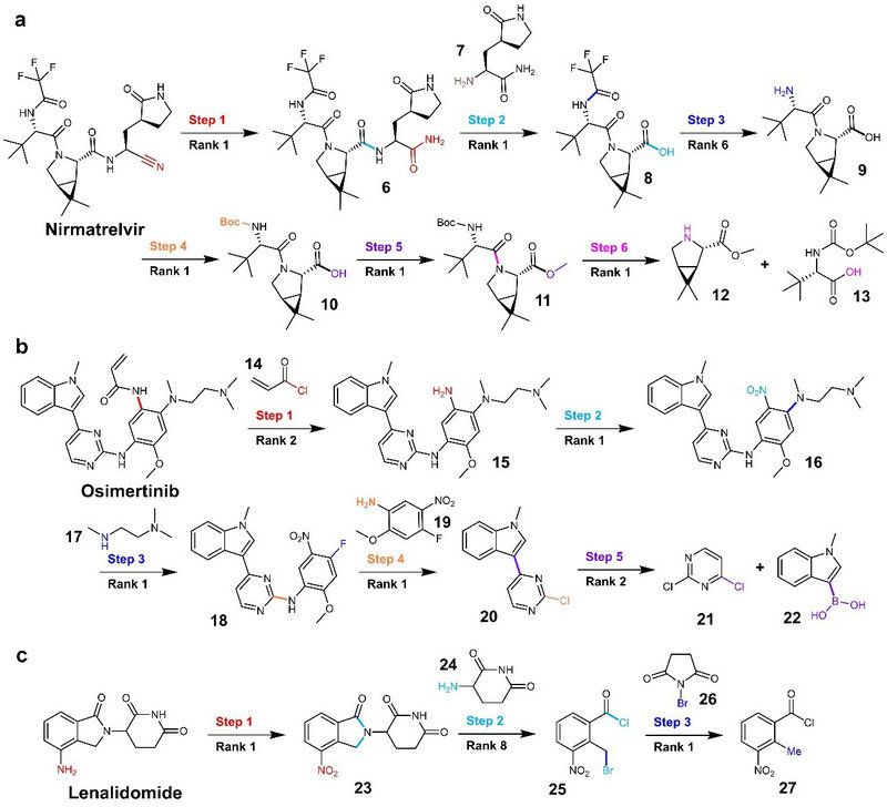 為了驗(yàn)證模型在合成路線規(guī)劃中的實(shí)際用途,該研究選擇了3個(gè)重磅藥物分子作為例子進(jìn)行合成路線的設(shè)計(jì),包括用于治療COVID-19的口服SARS-CoV-2 Mpro抑制劑奈瑪特韋(Nirmatrelvir),用于治療非小細(xì)胞肺癌的第三代EGFR抑制劑奧希替尼(Osimertinib)和用于治療多發(fā)性骨髓瘤的來(lái)那度胺(Lenalidomide)。結(jié)果顯示,Graph2Edits模型成功地預(yù)測(cè)了這些藥物分子的完整合成路線,驗(yàn)證了其在分子的多步逆合成路線設(shè)計(jì)中潛在的實(shí)際應(yīng)用價(jià)值。