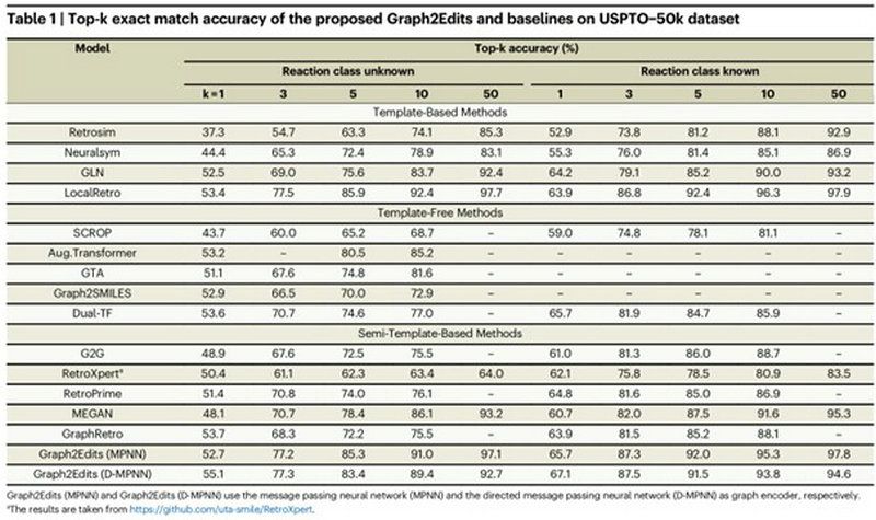 實(shí)驗(yàn)表明,與基準(zhǔn)模型相比,Graph2Edits在不同評(píng)估方法中實(shí)現(xiàn)了更高的逆合成預(yù)測(cè)精度,top-1精確匹配精度達(dá)到了55.1%,能夠有效地搜索合理反應(yīng)的潛在空間,顯示出在復(fù)雜反應(yīng)中優(yōu)秀的適用性和泛化能力,提高了預(yù)測(cè)結(jié)果的多樣性和可解釋性。