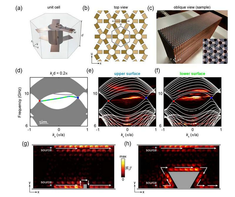 圖1. 光子晶體原胞結構(a)及俯視圖(b);(c)實驗樣品照片;(d-f)上、下表面反手性表面態色散曲線;(g-h)反手性模式的光魯棒傳輸。