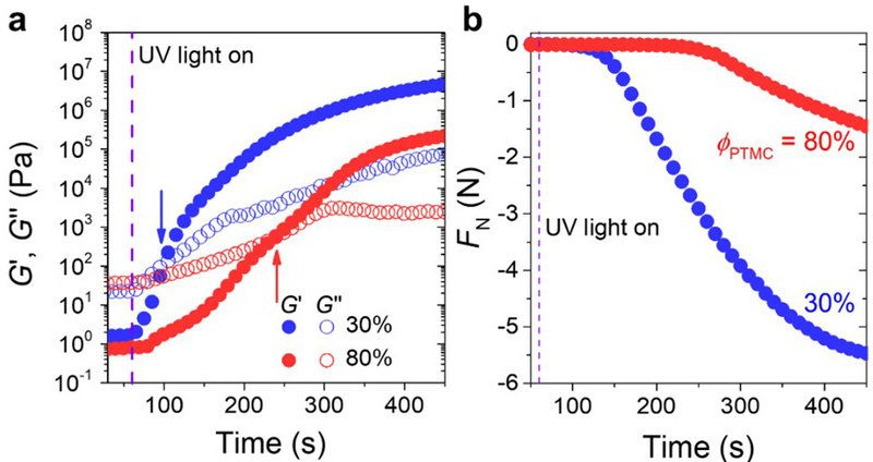 圖2. PPF-co-PTMC多嵌段共聚物的原位光流變測試(a)儲能模量G'和損耗模量G'';(b)收縮應力FN。