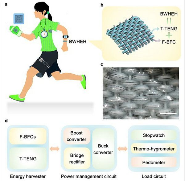 為此,衣芳教授課題組報(bào)道了一種由織物型摩擦納米發(fā)電機(jī)(T-TENG)和纖維型生物燃料電池(F-BFCs)編織而成的新型透氣可編織柔性可穿戴復(fù)合式能量收集器件(BWHEH),該器件具有良好的透氣性、柔韌性、舒適性。研究設(shè)計(jì)了匹配和優(yōu)化TENG和BFC兩種器件輸出特性的能量管理電路,大大提高了復(fù)合式能量收集器件的輸出功率,顯著降低了有效內(nèi)部阻抗,實(shí)現(xiàn)以穩(wěn)定的直流電源可持續(xù)地為電子設(shè)備供電,而且提高了TENG-BFC復(fù)合式能量收集器件作為電源的可靠性、穩(wěn)定性、噪聲和精度。詳細(xì)闡釋了TENG-BFC復(fù)合的能量管理原理。所設(shè)計(jì)制備的BWHEH自充電能量管理系統(tǒng)可以通過收集人體運(yùn)動(dòng)能和人體汗液能為常見便攜式電子設(shè)備持續(xù)供電。這項(xiàng)工作為能量收集提供了新的途徑,并為大功率復(fù)合式能量收集器件提供了基礎(chǔ)指導(dǎo)。