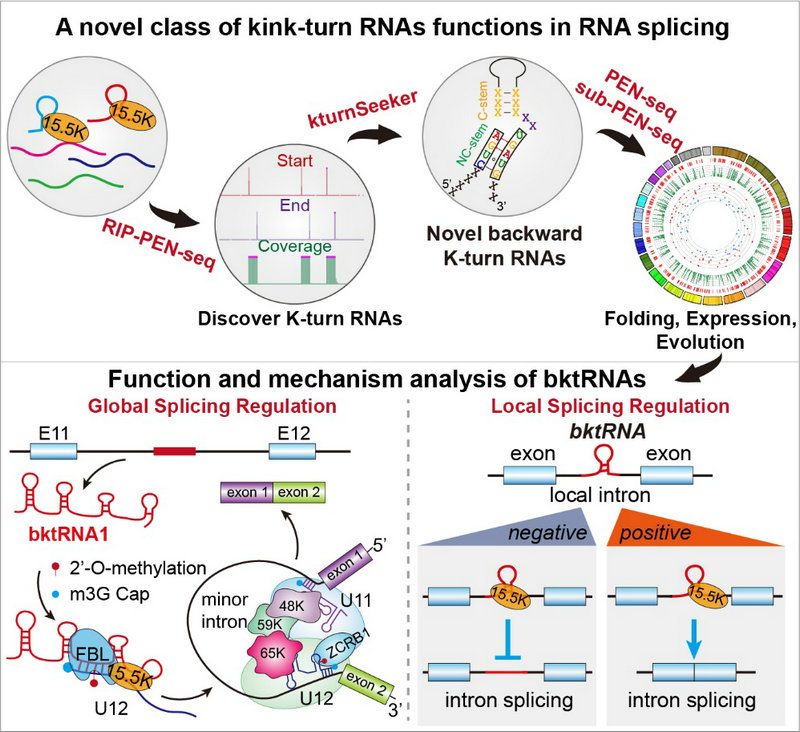 中山大學生命科學學院的楊建華和屈良鵠教授團隊開發了RIP-PEN-seq/PEN-seq/sub-PEN-seq等測序技術和kturnSeeker算法發現在固定位置出現后向(backward)K-turn結構和序列基序的新類型ncRNA(bktRNA),并解析了它們的表達、折疊結構特性及其在RNA剪接和修飾中的功能機制,為發現新的ktRNA/ncRNA及其功能機制研究提供了新方法和新思路。