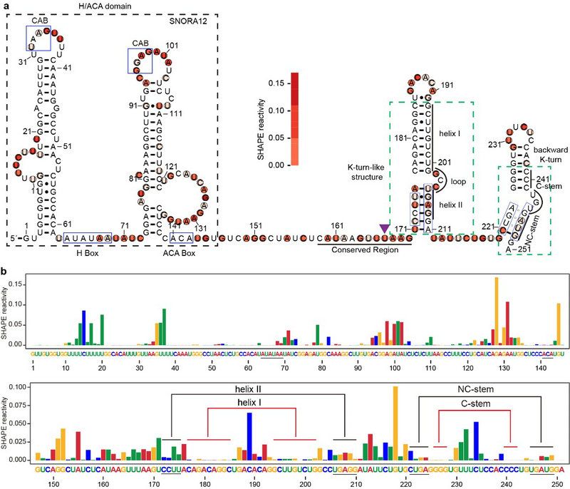 研究團隊通過分析保守的bktRNA1基因二級結構的共進化和SHAPE信號值,發現它是一個由后向K-turn結構基序與box H/ACA snoRNA (SNORA12)構成的嵌合ncRNA分子 (圖2)。在不同細胞類型中的亞細胞定位分析都發現bktRNA1主要存在于Cajal Body中。同時,通過刪除和突變bktRNA1的后向K-turn結構發現后向K-turn結構基序對于bktRNA1的加工、成熟及穩定存在是必不可少的。