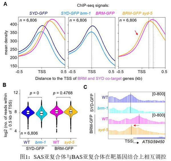 為了表征三種不同的植物SWI/SNF復合體并確定其亞基組成的差異是否會導致不同的基因組靶向,該研究通過染色質免疫沉淀結合高通量測序(ChIP-seq),繪制了SAS、MAS和BAS亞復合體的全基因組靶基因圖譜。發現三種植物SWI/SNF亞復合體在染色質上既有重疊也有特異性的基因組靶向性,另外三種SWI/SNF亞復合體在靶基因上的結合位置也存在差異。同時該研究也發現SAS亞復合體的突變會導致BAS亞復合體的結合往上游啟動子區域偏移,揭示了BAS亞復合體的基因組定位依賴于SAS亞復合體;另外,BAS亞復合體的突變會導致SAS亞復合體在它們共靶基因上的結合強度下降(圖1)。