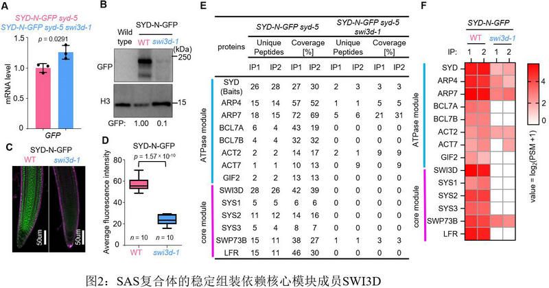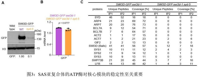 同時,該研究通過研究SAS亞復合體的組裝情況,證明了SAS亞復合體核心模塊亞基SWI3D在SAS亞復合體穩定中的關鍵作用(圖2)。SWI3D丟失使SAS復合體解體,同時會破壞SYD在靶基因上的結合;另一方面,刪除SWI3D 的SANT結構域會破壞SWI3D-SYD之間的相互作用從而導致SWI3D蛋白質豐度的降低. 因此,推測可能與哺乳動物SWI/SNF復合體組裝不一致,植物中的ATP酶催化亞基可能穩定核心模塊的組裝。為了驗證這種可能性,將syd-5突變體引入SWI3D-GFP轉基因植株中。令人驚訝的是,發現在缺少SYD催化亞基的情況下,SWI3D-GFP蛋白水平顯著降低,這表明SAS亞復合體中的ATP酶對核心模塊的穩定起著至關重要的作用(圖3)。