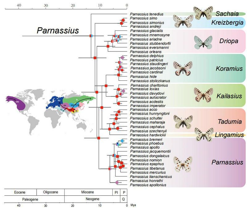 為了厘清絹蝶屬物種的系統(tǒng)進(jìn)化歷史,中山大學(xué)生命科學(xué)學(xué)院張鵬教授與華南農(nóng)業(yè)大學(xué)王厚帥副教授團(tuán)隊(duì)通過長期系統(tǒng)的野外考察與館藏標(biāo)本交換,收集了大量珍貴的絹蝶屬樣品,覆蓋了絹蝶屬目前已知的75%的物種。研究團(tuán)隊(duì)利用張鵬教授最新開發(fā)的擴(kuò)增子雜交捕獲技術(shù),克服了蝴蝶干標(biāo)本DNA降解嚴(yán)重的技術(shù)難題,測定了絹蝶物種的144個(gè)核基因編碼序列和全長線粒體基因組序列,利用系統(tǒng)發(fā)育基因組學(xué)研究手段可靠解析了絹蝶屬物種間的系統(tǒng)發(fā)育關(guān)系,確定了絹蝶8個(gè)亞屬間的系統(tǒng)位置,發(fā)現(xiàn)分布于蒙古地區(qū)的Sachaia亞屬是絹蝶中最早分化出來的類群(圖2)。