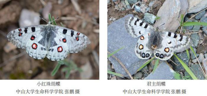 中大新聞網(wǎng)訊(通訊員梁丹)絹蝶是一種生活在高海拔山區(qū)的蝴蝶,以其翅膀形狀酷似半透明的薄絹而得名。其潔白色翅膀上常綴有亮紅色、橙色、藍(lán)色的圓斑(見圖1),外觀典雅高貴。絹蝶隸屬于鳳蝶科、絹蝶亞科、絹蝶屬,廣泛分布于歐亞大陸及北美洲,包括55種。該類群中許多物種如君主絹蝶和阿波羅絹蝶都是國家二級(jí)保護(hù)動(dòng)物。絹蝶屬內(nèi)的大部分物種能夠適應(yīng)寒冷和高海拔的山地環(huán)境,有些物種活動(dòng)的最高極限可達(dá)海拔6000米。因此,它們被譽(yù)為“雪線上飛舞的精靈”,是研究昆蟲高海拔適應(yīng)的良好模型。雖然絹蝶屬是一個(gè)典型的高海拔分布類群,但其中也有少數(shù)物種生活在低海拔地區(qū)。學(xué)界對于該屬的起源存在爭議,一說是起源于高海拔環(huán)境,隨后部分物種逐漸往低海拔地區(qū)遷移,另一說是起源于低海拔環(huán)境,隨后逐漸適應(yīng)高海拔山區(qū)。此外,絹蝶物種的幼蟲以許多不同科的植物為食,而且大多數(shù)種類是專食性的。絹蝶物種與其植物宿主的共同演化過程以及與其物種多樣性分化的關(guān)系也是值得研究的問題。一個(gè)穩(wěn)健的絹蝶物種系統(tǒng)進(jìn)化框架是開展相關(guān)研究的基礎(chǔ),然而以往研究重建的絹蝶物種的系統(tǒng)發(fā)育關(guān)系相當(dāng)不穩(wěn)定,一些重要的節(jié)點(diǎn),特別是基部支系仍有爭議。