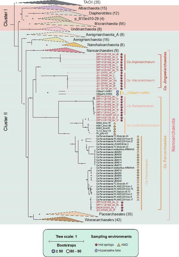 該研究揭示DPANN古菌對高溫以及酸性極端環境的適應性機制,并對其相關祖先性狀進行了重構。研究成果以Metagenomic Discovery of “Candidatus Parvarchaeales”-Related Lineages Sheds Light on Adaptation and Diversification from Neutral-Thermal to Acidic-Mesothermal Environments為題發表于學術期刊mSystems。中山大學為該成果的第一完成單位。本論文得到國家自然科學基金的支持。