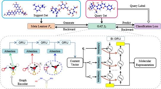 中山大學(xué)智能工程學(xué)院智能醫(yī)療研究中心主任陳語(yǔ)謙教授團(tuán)隊(duì)提出了一種具有圖注意力網(wǎng)絡(luò)(GAT)的元學(xué)習(xí)架構(gòu)(Meta-GAT)去預(yù)測(cè)低數(shù)據(jù)藥物發(fā)現(xiàn)中的分子特性。圖注意力網(wǎng)絡(luò)通過(guò)三重注意力機(jī)制在原子層面捕獲原子團(tuán)的局部影響,從而使GAT學(xué)習(xí)原子團(tuán)對(duì)化合物性質(zhì)的影響。在分子層面,GAT將整個(gè)分子視為連接分子中每個(gè)原子的超虛擬節(jié)點(diǎn),隱含地捕捉不同原子團(tuán)之間的相互作用。雙向循環(huán)神經(jīng)網(wǎng)絡(luò)(GRU)側(cè)重于將有限的分子信息抽象或轉(zhuǎn)化為更高層次的特征向量或元知識(shí),提高了GAT感知分子中化學(xué)環(huán)境和連通性的能力,從而有效降低樣本復(fù)雜度。此外,進(jìn)一步開發(fā)了一種基于雙層優(yōu)化的元學(xué)習(xí)策略,將元知識(shí)從其他屬性預(yù)測(cè)任務(wù)遷移到低數(shù)據(jù)場(chǎng)景下的目標(biāo)任務(wù),使模型能夠快速適應(yīng)樣本少的分子屬性預(yù)測(cè)。實(shí)驗(yàn)表明,Meta-GAT 在多個(gè)公共基準(zhǔn)數(shù)據(jù)集上實(shí)現(xiàn)了對(duì)少數(shù)樣本分子新特性的準(zhǔn)確預(yù)測(cè)。這些優(yōu)勢(shì)表明 Meta-GAT 很可能成為低數(shù)據(jù)藥物發(fā)現(xiàn)的可行選擇。