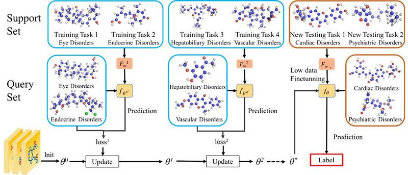 圖1. 在小樣本藥物發(fā)現(xiàn)場(chǎng)景下用于分子特性預(yù)測(cè)的元學(xué)習(xí)框架。藍(lán)色框和橙色框分別代表訓(xùn)練階段和測(cè)試階段的數(shù)據(jù)流。
