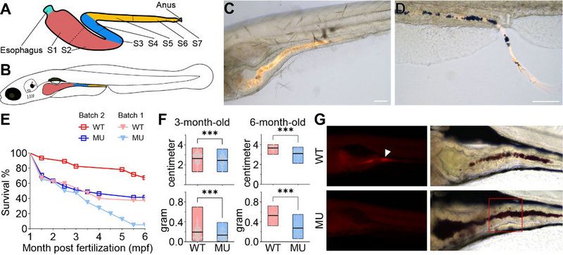 圖1:斑馬魚腸道幾丁質形態(tài)以及敲除前后的表型變化(A:斑馬魚成魚腸道分段示意圖;B:斑馬魚幼魚腸道分段示意圖;C,D:斑馬魚幼魚腸道幾丁質膜染色圖,橘色為幾丁質膜;E:一到六月齡斑馬魚生存率比較;F:三和六月齡斑馬魚體長體重比較,WT=野生型,MU=突變型;G:敲除前后幼魚腸道幾丁質膜以及消化過程對比,白色箭頭指向幾丁質膜,紅色方框框出陷入腸絨毛間的微珠)。