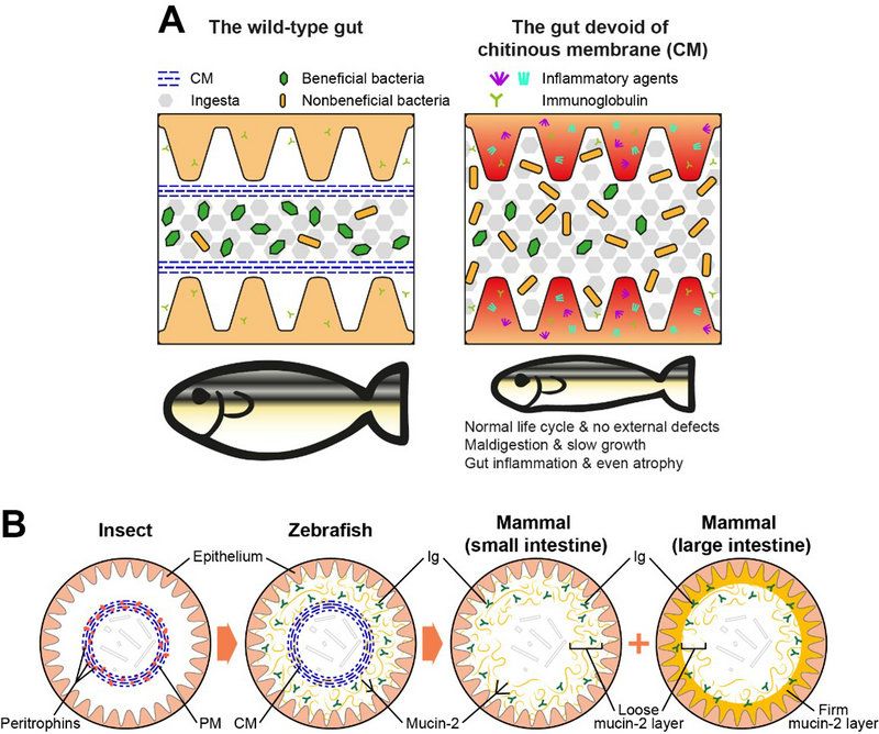 中山大學生命科學學院徐安龍教授和黃盛豐教授團隊長期專注于海洋與水生動物的黏膜功能及其免疫防御機制。最近,他們利用斑馬魚模型,第一次對魚類腸道幾丁質膜的在消化和免疫中的不同效用進行了解析,發(fā)現(xiàn)相比昆蟲等無脊椎動物,斑馬魚幾丁質膜的分區(qū)消化功能依然重要,但屏障免疫作用下降,且不再是存活與繁殖的必需結構。