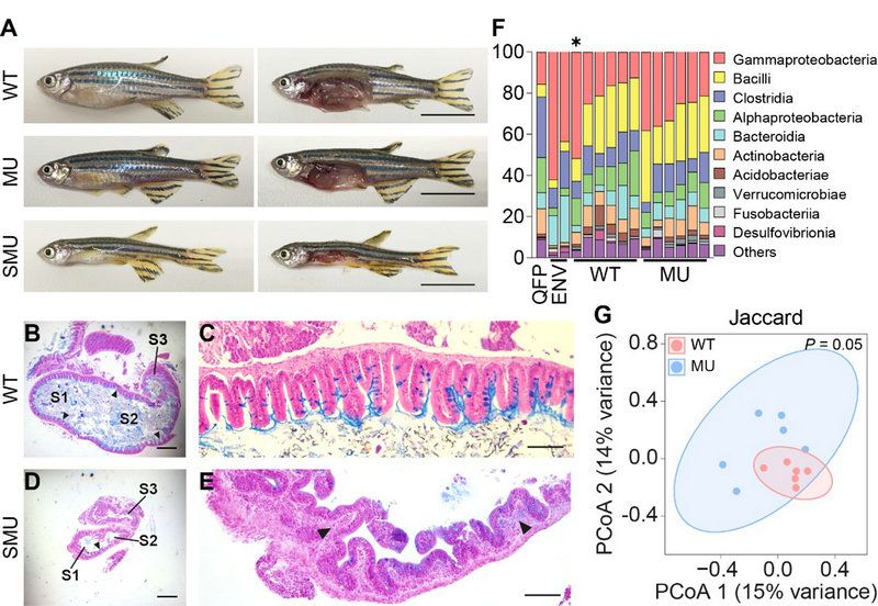 圖2:斑馬魚腸道萎縮的圖以及腸道微生物變化(A:六月齡不同斑馬魚對比,WT=健康野生型,MU=健康突變型,SMU=生病突變型;B – E:成魚腸道切片阿爾新藍染色圖,C為B的局部放大,E為D的局部放大;F:斑馬魚腸道微生物物種柱狀圖,QFP=濾紙對照,ENV=環(huán)境水樣對照;G:斑馬魚腸道微生物主坐標分析圖)。