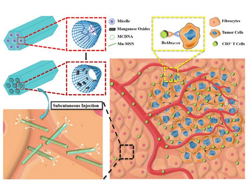 圖1 一種基于納米棒的新型免疫調節納米平臺。在磁共振成像引導下,高縱橫比納米棒和細胞間存在界面刺激作用,協助雙特異性靶向抗體編碼微環DNA的體內遞送