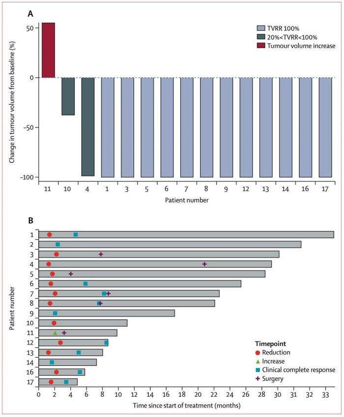 研究共入組了17例初診dMMR/MSI-H局部晚期直腸癌患者,在16例可評估療效的患者中有15例的腫瘤在治療后縮小。其中,6例患者接受了根治性手術,有3例達到病理完全緩解;9例患者達到臨床完全緩解并選擇了隨訪觀察,從而避免了放化療及手術的損傷;1例患者因不良反應提前終止治療。研究總的完全緩解率高達75%。此外,本研究中患者達到臨床完全緩解的中位時間為5.2個月,提示和傳統的新輔助放化療相比,免疫治療可能需要較長的時間才能達到最佳療效。在毒副作用方面,觀察到的不良反應大多數為1-2級,僅發生1例3級以上不良事件。這組病人隨訪到2022年11月,均未出現腫瘤復發。
