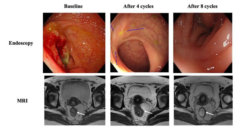 一例患者治療前后的腸鏡及MRI圖像,可見腫物已完全消退