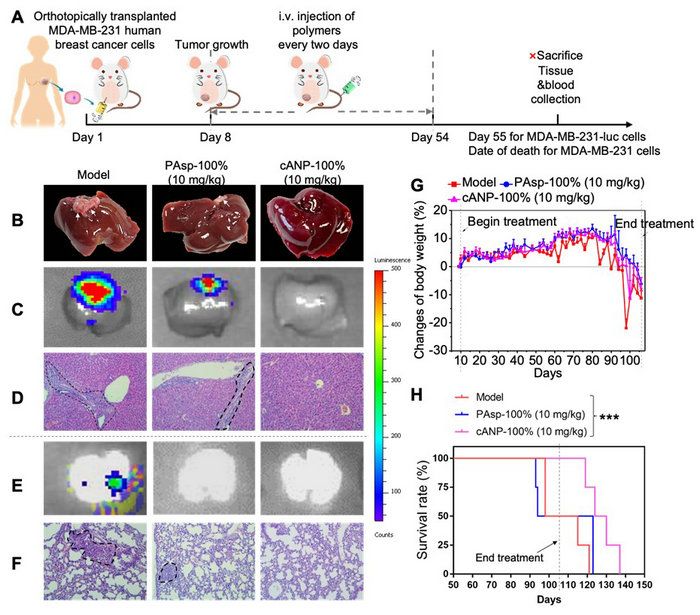 圖4. cANP-100%的治療有效減少MDA-MB-231人乳腺癌原位模型中癌細胞的肝轉移和肺轉移。(A)MDA-MB-231原位乳腺癌模型的實驗流程圖;(B)cANP-100%的治療有效減少肝腫瘤結節數;(C)luminescence圖顯示cANP-100%有效抑制MDA-MB-231-luc腫瘤細胞向肝臟的遷移;(D)HE組織切片顯示cANP-100%治療后肝臟沒有明顯的腫瘤細胞浸潤;(E)luminescence圖顯示陽離子聚天冬氨酸材料都有效抑制MDA-MB-231-luc腫瘤細胞向肺部的遷移;(F)HE組織切片顯示cANP-100%組肺部沒有明顯的腫瘤細胞浸潤;(G)治療過程中小鼠的體重變化(H)cANP-100%的治療有效延長腫瘤小鼠的生存期。