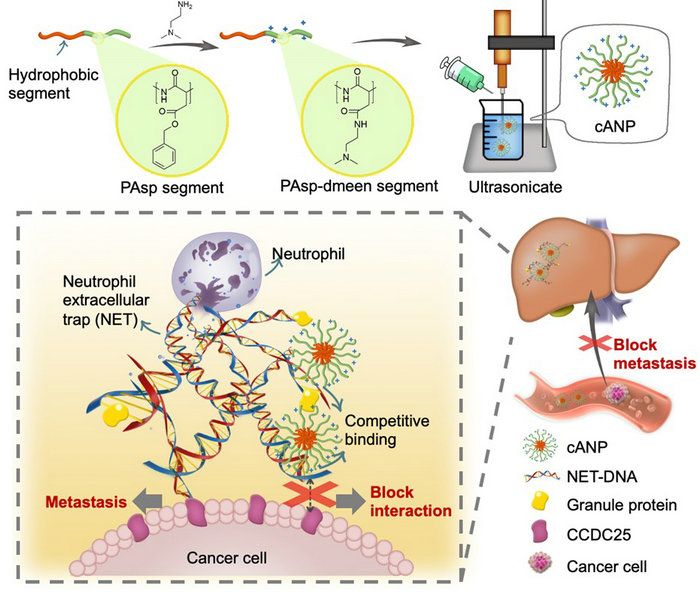 圖1. cANP的制備和通過結合NET-DNA抑制NET誘導的腫瘤轉移的示意圖