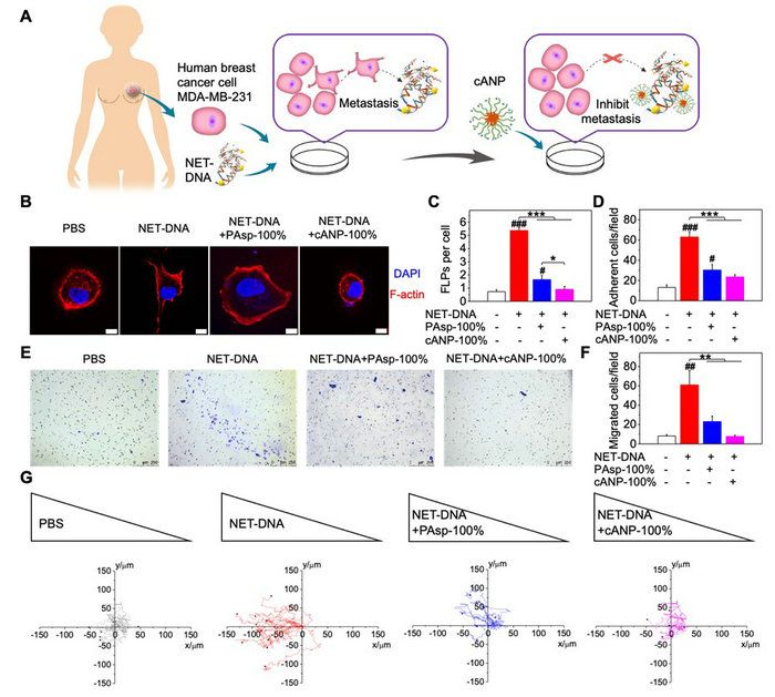 圖2. cANP 抑制人乳腺癌腫瘤細胞中由NET-DNA誘導的細胞趨化功能。(A)cANP通過結合NET-DNA抑制NET介導的人乳腺癌細胞轉移的示意圖;(B-C)陽離子聚氨基酸材料中和NET-DNA抑制NET-DNA誘導的癌細胞骨架變形(B-C)、癌細胞粘附(D)、癌細胞遷移(E-F)與癌細胞趨化能力(G)。