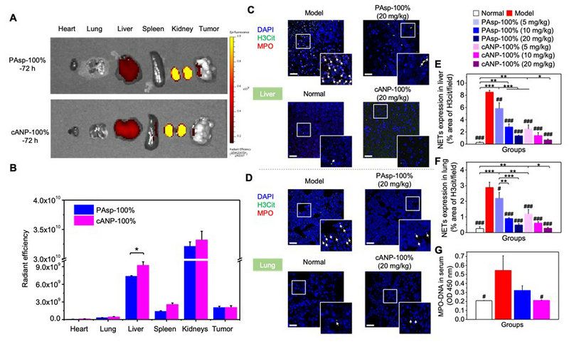 圖3. 在肝臟有更好積累的cANP能更好地減少小鼠原位乳腺癌模型局部NET的浸潤以及血清中NET-DNA的含量。(A-B)72小時PAsp-100%與cANP-100%在體內的分布情況;(C-F)不同組別中NET在乳腺癌模型肝臟(C, E)和肺部(D,F)的浸潤情況;(G) 血清中MPO-DNA的濃度。