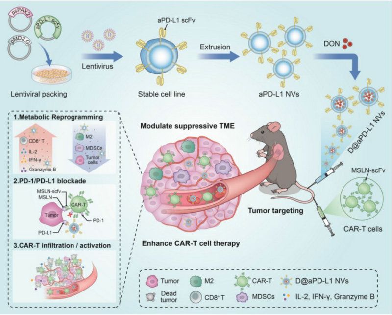 該研究開發(fā)了一種能增強(qiáng)CAR-T細(xì)胞治療實體瘤功效的潛在藥物——多功能基因重編程細(xì)胞囊泡(D@aPD-L1 NVs),該藥物通過負(fù)載谷氨酰胺拮抗劑以改善抑制性的腫瘤微環(huán)境達(dá)到增強(qiáng)CAR-T細(xì)胞在肺癌中的治療效果,具有良好的臨床轉(zhuǎn)化潛力和應(yīng)用前景,對進(jìn)一步的臨床應(yīng)用具有重要的指導(dǎo)和借鑒意義,為肺癌領(lǐng)域的治療提供了一種新的策略選擇手段。該成果已申請相關(guān)專利。