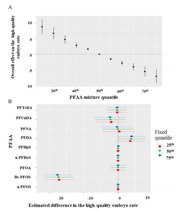 該研究是一項環境與生殖健康大型輔助生殖隊列前瞻性研究(Guangxi In Vitro Fertilization and the Environment Study,GIVES)。2018年7月-12月期間,在廣西壯族自治區人民醫院生殖醫學中心招募了729名接受IVF治療的女性。使用超高效液相色譜-串聯質譜法測定卵泡液中32種PFAA濃度水平,應用限制性立方樣條、線性回歸和對數二項回歸模型來研究卵泡液PFAA與IVF胚胎質量的關聯,并將卵母細胞成熟度作為干預變量進行因果中介分析,利用貝葉斯核機器回歸模型(BKMR)進一步評估PFAA混合物對結局的影響。研究發現隨著卵泡液中PFAA濃度增高,IVF高質量胚胎率隨之降低(圖1A),全氟辛烷磺酸支鏈異構體(Br-PFOS)是主要效應污染物(圖1B)。