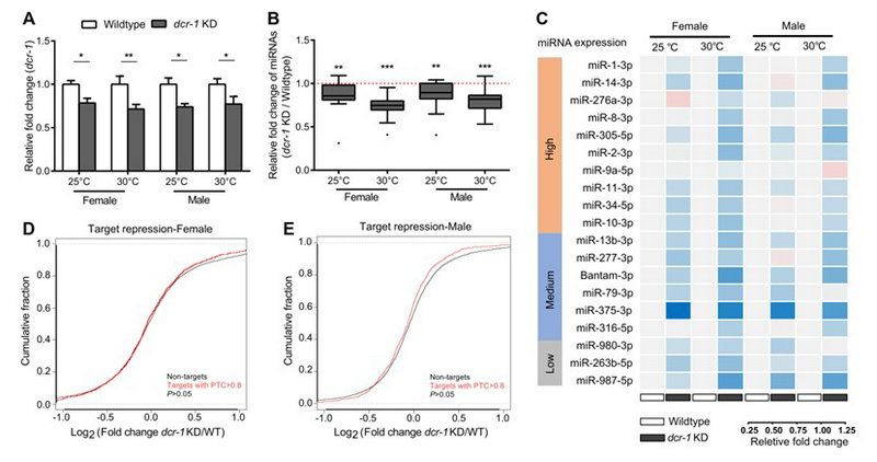 圖1. 果蠅microRNA介導的渠化調控研究體系。圖中示意黑腹果蠅dicer-1敲低品系,在該遺傳背景中,基因組中microRNA的表達水平被廣泛且微弱地下調。