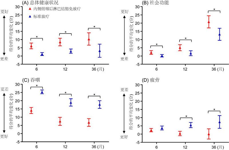 在毒副反應和生活質量方面,內側組咽后淋巴結區豁免放療組放療相關毒副反應發生率更低,包括急性黏膜炎(內側組咽后淋巴結豁免放療組67.7%對標準放療組79.8%)、急性吞咽困難(25.5%對35.1%)、體重下降(46.8%對57.8%)以及晚期吞咽困難(24.0%對34.3%)。另外,內側組咽后淋巴結區豁免放療組在健康狀況、社會功能、是否容易疲勞及吞咽困難等方面的生活質量均明顯優于標準放療組。