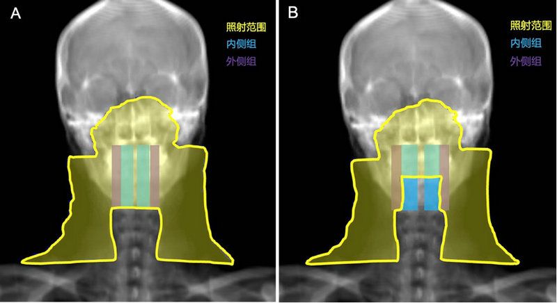 A對照組:內、外側組咽后淋巴結區均接受預防照射(左)