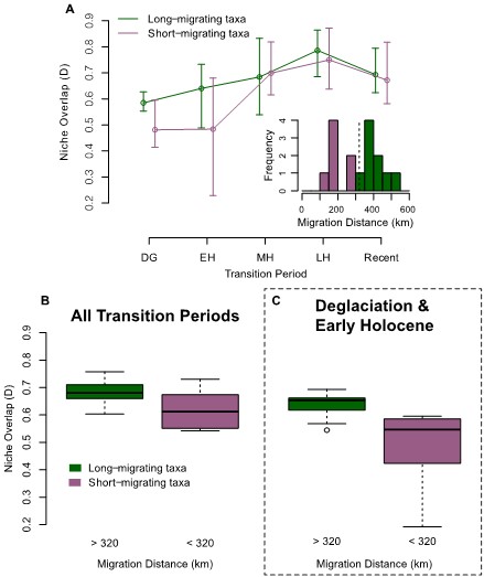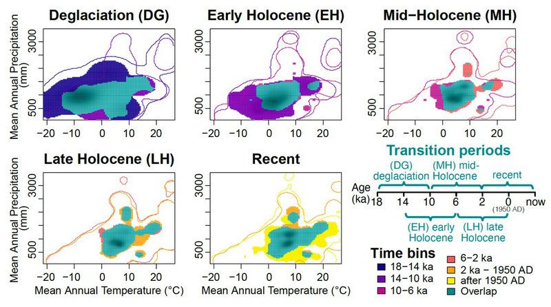 研究發現,即使是在劇烈的氣候變化下,75%的植物展現出了高氣候黏性和穩定的生態位,說明植物普遍具有較好的追蹤氣候變化的能力。榆屬、山毛櫸屬、白蠟樹屬、樺屬植物的氣候黏性較低,推測原因是發生在距今8000-5000年前的病蟲災害影響了這幾種植物的擴散和分布區的擴張。研究還發現,擴散能力強、擴散距離遠的植物,生態位更穩定,氣候黏性更強。這一點特征在距今18000-10000年前氣候劇烈變化的時候表現得更為明顯。