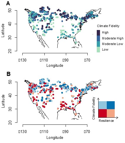 圖3 氣候黏性的地理分布。相比低氣候黏性的地區,高氣候黏性的地區(climate fidelity hotspots)氣候彈性更高,即地形更為復雜、微氣候環境更為多樣。但是,高氣候黏性的地區同時也展現了更低的地理連通性。保護生態學家應對這些地區多加警惕,留意在未來氣候變化影響下,當地的植物是否需要額外的幫助以擴散到適宜的氣候環境。