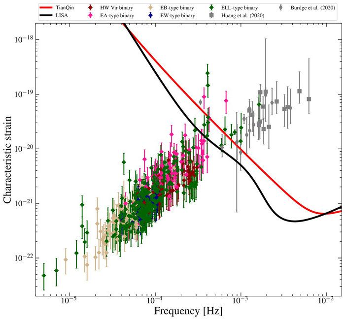 圖1: 密近白矮星雙星候選體的引力波頻率強度分布,彩色點為該研究發現的429顆密近白矮星雙星候選體(不同顏色對應不同類型雙星,具體見圖例),灰色點為前人的研究中發現的驗證雙星。紅色線為天琴的靈敏度曲線,黑色線為LISA靈敏度曲線。