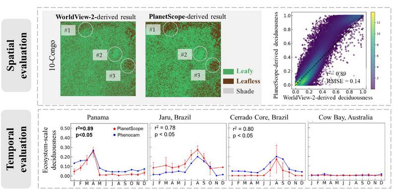 該研究在具有大降水梯度(1,470-2,819 毫米每年)的 16 個熱帶森林地點(圖1)測試了該方法的有效性。在這些站點中分別使用超高分辨率衛星 WorldView-2(n=9 個站點)和地面物候相機 phenocams(n=9 個站點)對微小衛星(PlanetScope)獲取的落葉度進行了精度評估。