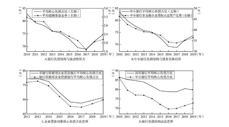 由于銀行持有信貸類資產需要長期穩定的流動性支持,相較其他短期債務,存款具有更低的成本和擠兌風險,因而存款和貸款活動具有極強的協同性。同時信貸市場上昂貴的借款對象轉換成本也促使中小企業更加傾向于從流動性充足穩定的銀行借款。然而近年來迅速發展的影子銀行活動極大擠壓了存款市場,銀行系統尤其是中小銀行的負債結構日漸扭曲。2010-2019年銀行系統平均核心負債占比由86.30%下降至74.79%,與之相對應的是銀行業面臨的流動性壓力與日俱增,以及銀行信貸供給的下降。同時大小銀行間非對稱的負債結構惡化迫使中小企業調整借款對象,銀企信貸匹配結構逐漸扭曲,最終形成銀行與企業之間“捆綁的融資困境”。
