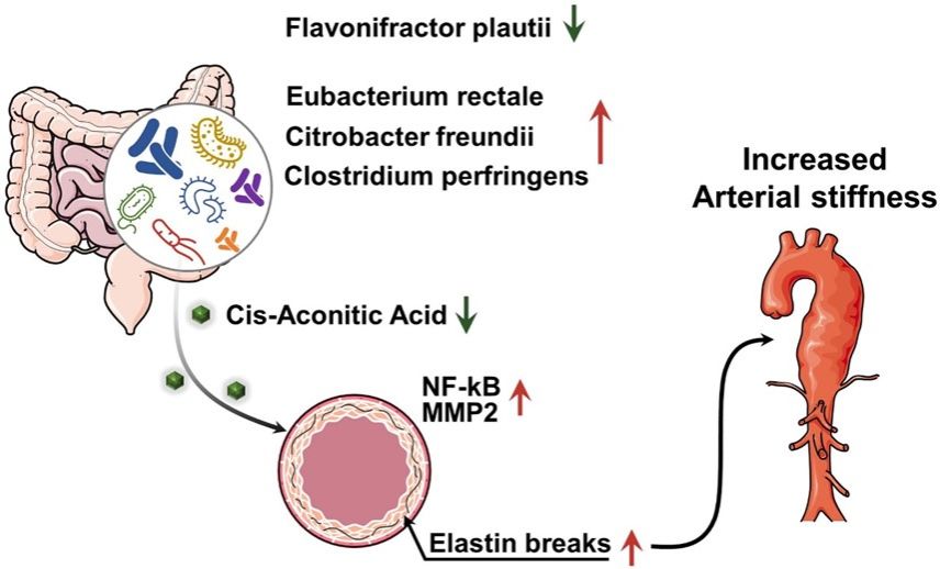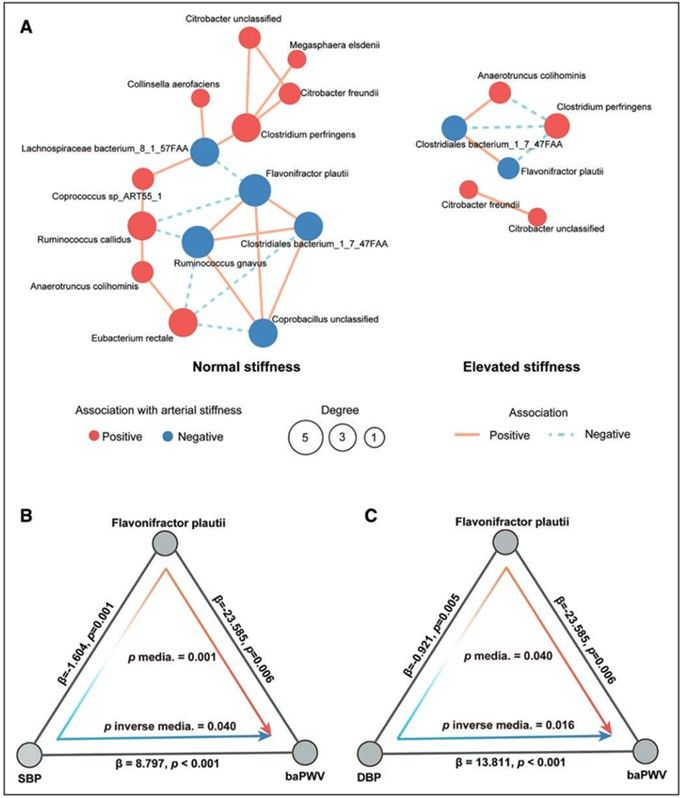 本研究首先通過宏基因組——代謝組——表型組多組學聯合分析發現Flavonifractor plautii是調節血管硬化程度的關鍵菌種,其相對豐度在動脈僵硬程度高的人群中顯著降低。順烏頭酸是Flavonifractor plautii調節動脈硬化程度的關鍵效應分子。
