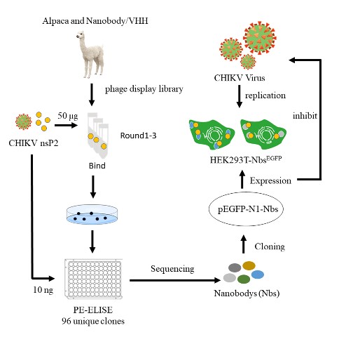 近日,中山大學公共衛生學院陸家海教授、陳澤良教授和第一作者鄧強(在讀博士生)等在抗病毒研究領域重要學術期刊Antiviral Research(IF=10.103)上發表了題為“Inhibition of Chikungunya virus early replication by intracellular nanoantibodies targeting nsP2 Epitope Rich Region”的研究論文。該項研究由中山大學公共衛生學院陸家海教授團隊領銜,聯合中外團隊,在科技部重點研發計劃和廣東省對接國家重大項目支持下,從羊駝天然噬菌體庫中篩選出了多個針對CHIKV病毒nsP2抗原的特異性納米抗體。研究發現納米抗體能夠抑制病毒早期復制。抗體的獲得,為進一步研究CHIKV nsP2功能,開發治療藥物等奠定了基礎。