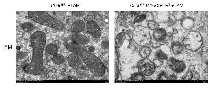 電鏡下觀察野生型和腸特異性敲除CHD6小鼠的線粒體形態(tài)