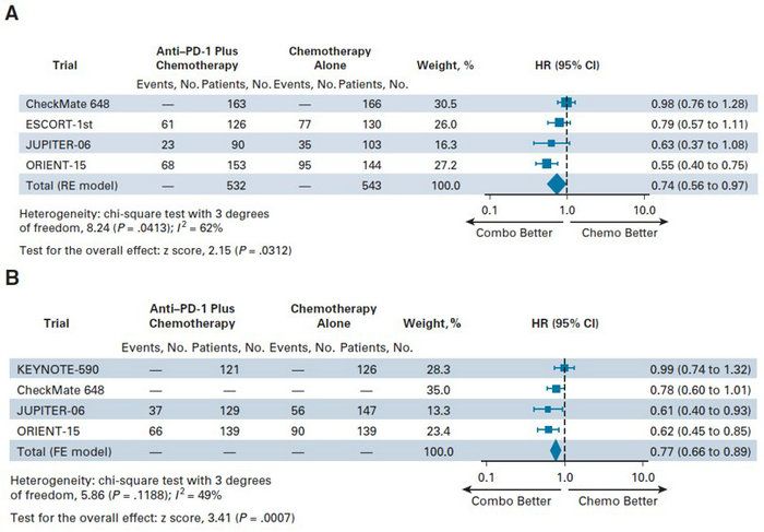 由于不同研究在納入人群、PD-L1檢測方法及化療方案等方面存在異質性,為進一步探索PD-1單抗聯合化療能否為PD-L1低表達食管鱗癌患者帶來真正臨床獲益,本研究綜合目前國際上探究PD-1單抗聯合化療一線治療晚期食管鱗癌的五項大型III期臨床試驗,即KEYNOTE-590、CheckMate 648、ESCORT-1st、JUPITER-06以及ORIENT-15研究的數據,進行了薈萃分析(meta-analysis)。結果表明,無論是基于腫瘤細胞陽性比例分數還是聯合陽性分數進行劃分,無論是在有效率(ORR)、無進展生存時間(PFS)還是總生存時間(OS)上,PD-L1低表達的食管鱗癌患者(TPS<1%或CPS<10)接受PD-1單抗聯合化療相較于單純化療同樣均能帶來更為顯著的臨床獲益。