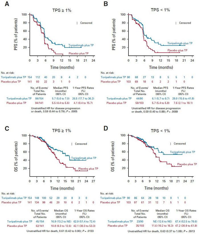 JUPITER-06基于腫瘤細胞陽性比例分數亞組分析的無進展生存時間(A、B)及總生存時間(C、D)結果
