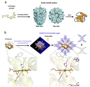 在細(xì)胞內(nèi),蛋白質(zhì)結(jié)構(gòu)的精準(zhǔn)折疊通常需要依賴分子伴侶的功能。分子伴侶是一種具有籠狀結(jié)構(gòu)的蛋白質(zhì)多聚體,籠狀空腔可封裝錯(cuò)誤折疊或非折疊的蛋白質(zhì),并在ATP作用下介導(dǎo)蛋白質(zhì)折疊成正確的結(jié)構(gòu)(圖1a)。受啟發(fā)于此,近年來(lái)科學(xué)家致力于設(shè)計(jì)人工多孔材料,通過類似的封裝作用調(diào)控蛋白質(zhì)構(gòu)象。盡管金屬有機(jī)框架、共價(jià)有機(jī)框架等多孔材料在蛋白質(zhì)封裝方面取得了系列的進(jìn)展,但目前仍未有有效策略來(lái)調(diào)控蛋白質(zhì)的構(gòu)象,并賦予蛋白質(zhì)非天然的本征活性。