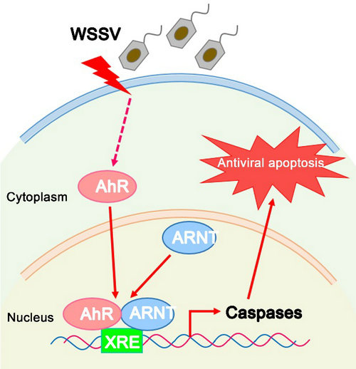養殖水體中的苯并芘、多氯聯苯等有機毒物來自工業廢水和廢氣,因其親脂性和難降解性會隨著生物鏈流動富集,不僅直接威脅對蝦生存,還會影響食用者的健康。芳香烴受體(aryl hydrocarbon receptor,AhR)是一類配體依賴的轉錄因子,能夠識別苯并芘和多氯聯苯激活機體解毒途徑。何建國教授團隊發現凡納濱對蝦AhR響應WSSV感染,通過與LvARNT偶聯直接靶向LvCaspase-1(人Caspase-3同源基因)的啟動子,調節LvCaspase-1的表達,誘導細胞凋亡,發揮抗病毒功能。該成果首次揭示AhR家族蛋白通過調控caspase表達以建立與細胞凋亡的直接聯系,表明LvAhR是提高對蝦抗病性和抗逆性的潛在選育靶點。