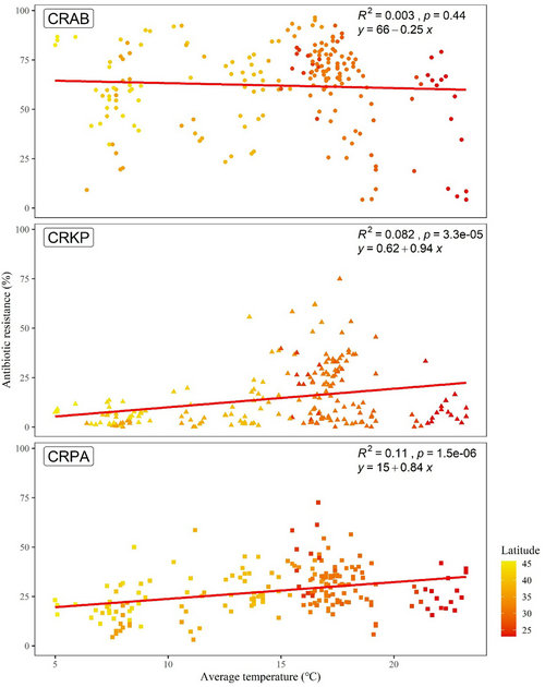 本研究利用中國細菌耐藥網監測網(CHINET)和中國統計年鑒的相關數據,系統探究了耐藥率與人口、經濟、醫療的氣候因素的多元聯系。研究對象選擇世界衛生組織列為需要緊急研發有效抗菌藥物應對的三種重要耐藥菌:耐碳青霉烯的鮑曼不動桿菌(CRAB)、肺炎克雷伯菌(CRKP)和銅綠假單胞菌(CRPA)。其中碳青霉烯類藥物對革蘭陽性和革蘭陰性細菌具有廣譜抗菌活性,而且對大多數β-內酰胺酶也具有顯著的穩定性,被稱為細菌感染最后的治療手段。研究發現,耐碳青霉烯的肺炎克雷伯菌(CRKP)和耐碳青霉烯的銅綠假單胞菌(CRPA)檢出率與氣溫呈現穩定的正向關聯:研究地區平均氣溫每上升1℃,CRKP檢出率上升到1.14倍(95%-CI [1.07~1.23]),CRPA上升到1.06倍(95%-CI [1.03~1.08])。