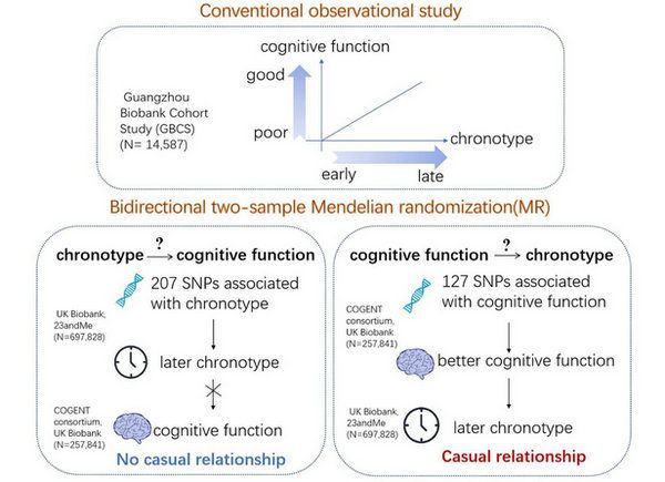 中大新聞網訊(通訊員王嬌)人的一生中幾乎有三分之一的時間是在睡眠中度過的,睡眠對人們的身體健康和精神狀況至關重要。睡眠晝夜節律是指睡眠-覺醒模式以24小時左右為周期的變動,又被稱為睡眠時型(chronotype),可分為早睡早起的“清晨型”(morning-type)與晚睡晚起的“夜晚型”(evening-type)。他們也被形象地叫做“百靈鳥型”(“larks”)和“貓頭鷹型”(“owls”),而處于中間的則被稱為“中間型”。通常情況下,早睡早起被認為是健康的生活習慣。在以往的研究中,相比清晨型,夜晚型人群的飲食與運動習慣較差,且與抑郁、肥胖、高血壓、糖尿病、心腦血管疾病等常見慢性病的關系更為密切。但是,晚睡晚起是否也會影響認知功能水平?結論尚且不清楚。