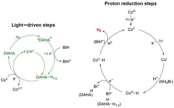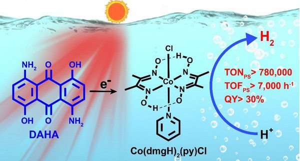 近日,中山大學化學學院韓治際教授課題組報道了一種蒽醌有機染料用于紅光下催化產氫體系(圖1)。在該體系利用低成本的蒽醌染料作為光敏劑,非貴金屬鈷配合物為催化劑,在紅光條件下,穩定性高達168小時(主要受限于溶液中的電子供體完全消耗),其催化轉化次數可達78萬,轉化頻率超過7000次每小時,量子效率超過30%,是目前已報道最好的紅光人工光合產氫體系(圖2)。通過機理研究表明,光敏劑(DAHA)獨特的激發態、穩定的氧化還原性質及超快的光生電子和電子轉移速率是體系獲得高效率和穩定性的關鍵。產氫的原理是:染料吸收太陽能后,其三重激發態被還原和質子化,形成的物種有效地還原鈷催化劑,逐步形成CoI、CoIII-H、CoII-H 等中間體,最后與質子反應產生氫氣(圖3)。該項工作為開發利用全太陽光譜進行各類光催化反應提供了一條新思路。