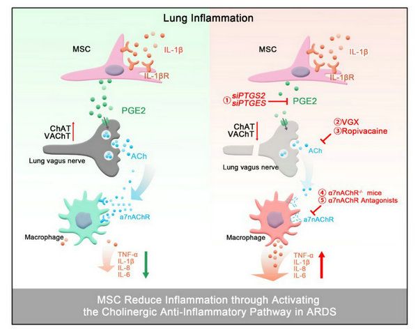 研究人員構建小鼠ARDS模型,發現靜脈輸注MSC明顯緩解了肺損傷癥狀,同時,膽堿能系統相關基因ChAT、VAChT在肺組織中表達量顯著增加,提示CAP可能在MSC治療ARDS的過程中發揮重要作用。課題組隨后證實MSC主要通過合成、分泌前列腺素E2促進ChAT表達和乙酰膽堿產生。
