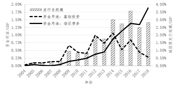 不同于已有研究從債務(wù)規(guī)模的角度分析地方融資平臺(tái)的債務(wù)風(fēng)險(xiǎn),該篇論文收集整理了2004-2018年城投債募集說明書中公布的募集資金用途,并將其分解為“基礎(chǔ)投資”用途和“償還債務(wù)”用途。數(shù)據(jù)顯示,在“四萬億”財(cái)政刺激計(jì)劃期間,以基礎(chǔ)設(shè)施建設(shè)為代表的市政投資是城投債的主要資金投向,但隨著時(shí)間的推移,用于借新還舊的融資規(guī)模急速增加,尤其是在2014年之后,借新還舊的資金規(guī)模開始超過了用于基礎(chǔ)投資的資金規(guī)模,城投債的主要融資目的已從基建投資轉(zhuǎn)化為償還存量負(fù)債。由此而來的問題是,如何對(duì)這一現(xiàn)象做出解釋,該現(xiàn)象背后是否反映出地方融資平臺(tái)的債務(wù)風(fēng)險(xiǎn)已呈現(xiàn)出新的特征?