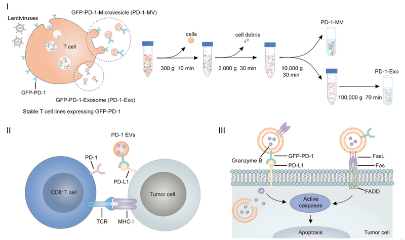 Ⅰ. PD-1-Exo和PD-1-MV的制備;Ⅱ. PD-1 EVs阻斷PD-1/PD-L1通路;TCR:T細胞受體,MHC-I:主要組織相容性復合體I;Ⅲ. PD-1 EVs誘導腫瘤細胞凋亡;FasL:Fas配體,FADD: Fas相關死亡結構域